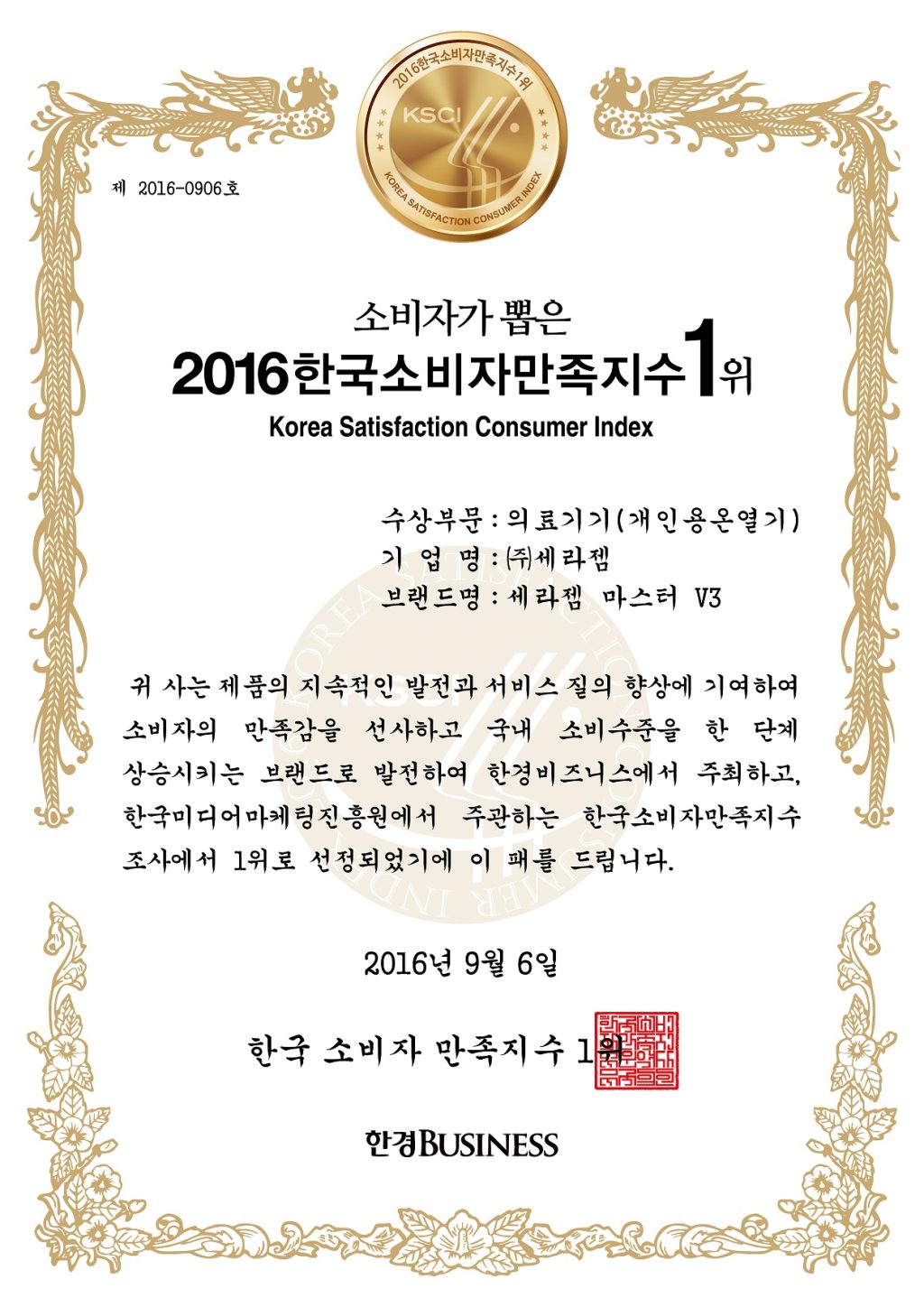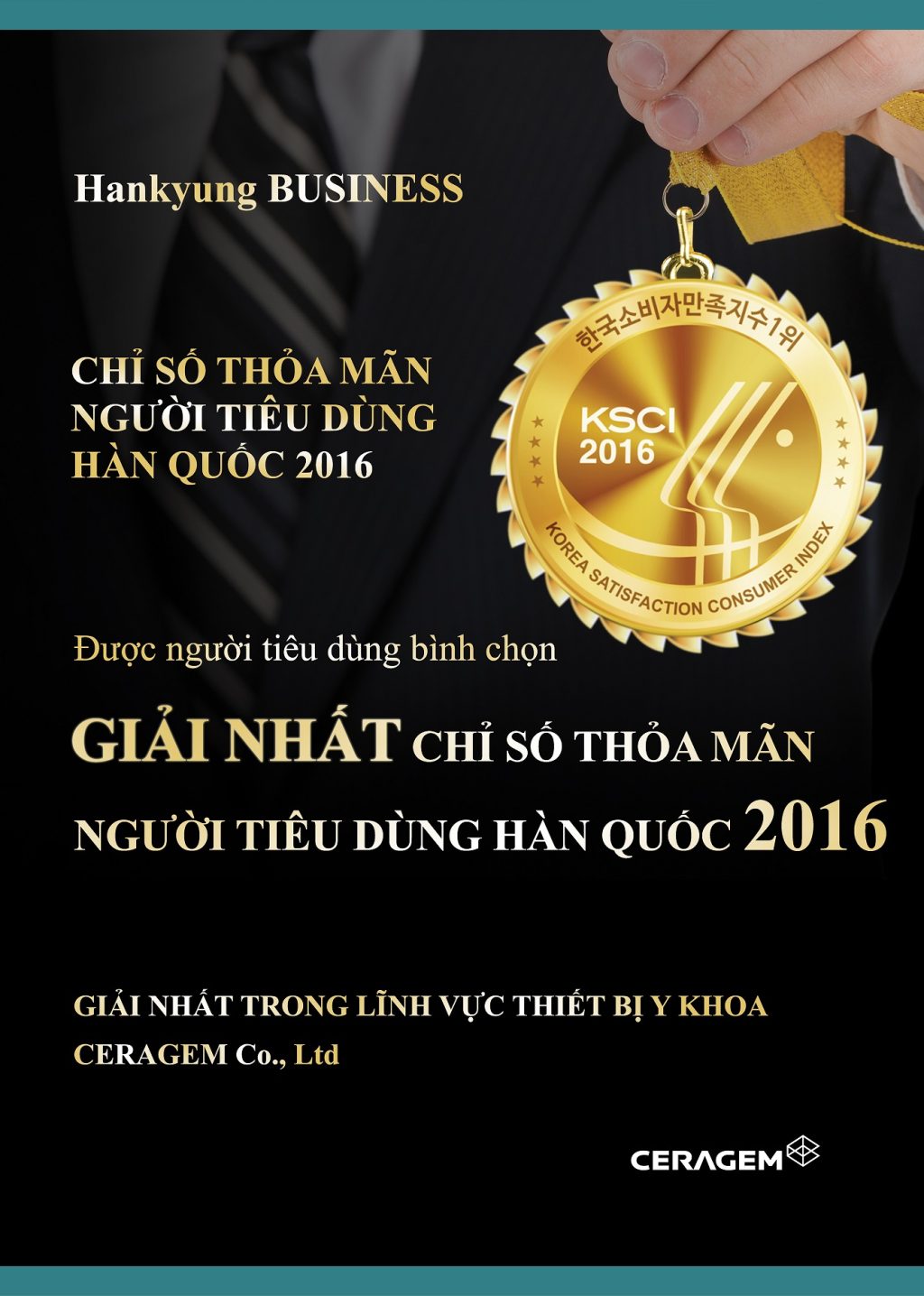 Trong ngày 6 tháng 9 vừa qua, Doanh nghiệp chăm sóc sức khỏe toàn cầu CERAGEM đã vinh dự được trao tặng Giải nhất cho chuyên ngành thiết bị y tế tại Buổi lễ trao giải CHỈ SỐ THỎA MÃN NGƯỜI TIÊU DÙNG HÀN QUỐC NĂM 2016 được tổ chức tại Khách sạn Ramada Hotel (thuộc quận Samseong, Seoul).