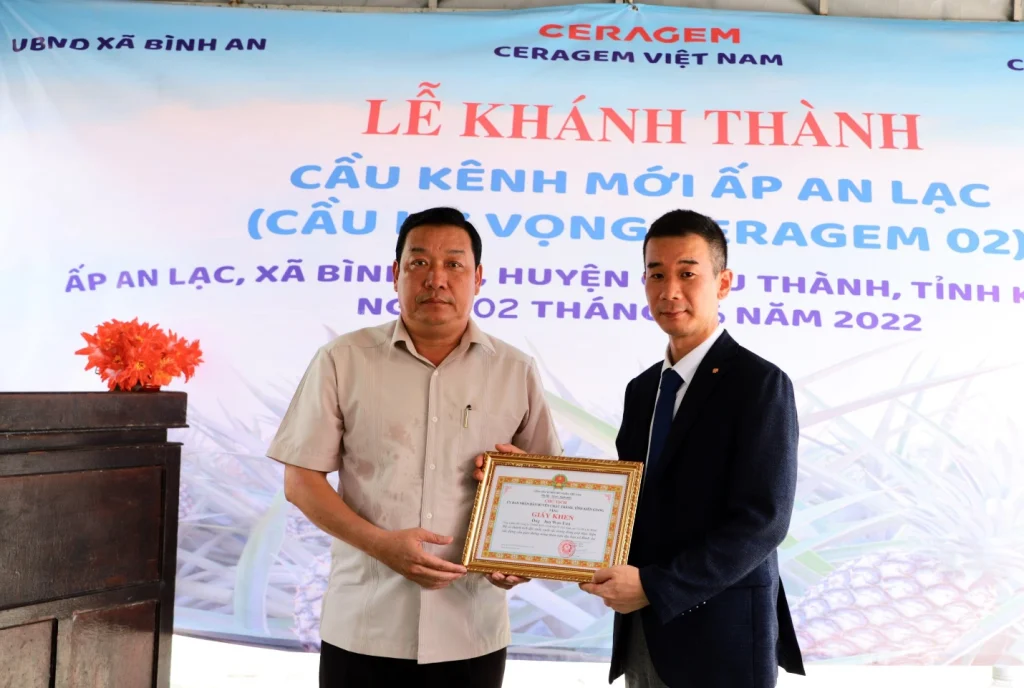 Công ty Ceragem Việt Nam cùng với tập thể các Giám Đốc thuộc khu vực Mỹ Tâm đã cùng nhau xây dựng Cầu Hy Vọng Ceragem 2 – tức Cầu Kênh Mới Ấp An Lạc nối liền ấp An Lạc, xã Bình An và ấp Thới Khương, xã Thới Quản, huyện Gò Quao với tổng kinh phí xây dựng gần 400.000.000đ, được thiết kế xây dựng kiên cố bằng vật liệu bê tông cốt thép, dài 25m, rộng 3.5m. Dự án được hoàn công và đưa và sử dụng với sự tham dự của các cấp chính quyền cũng như đông đảo bà con trong xã, với hy vọng mang đến cuộc sống thoải mái hơn, việc đi lại thuận tiện hơn cho bà con trong khu vực, góp phần vào việc thúc đẩy phát triển kinh tế – xã hội địa phương nói chung và sự phát triển của xã Bình An nói riêng trong thời gian tiếp theo.